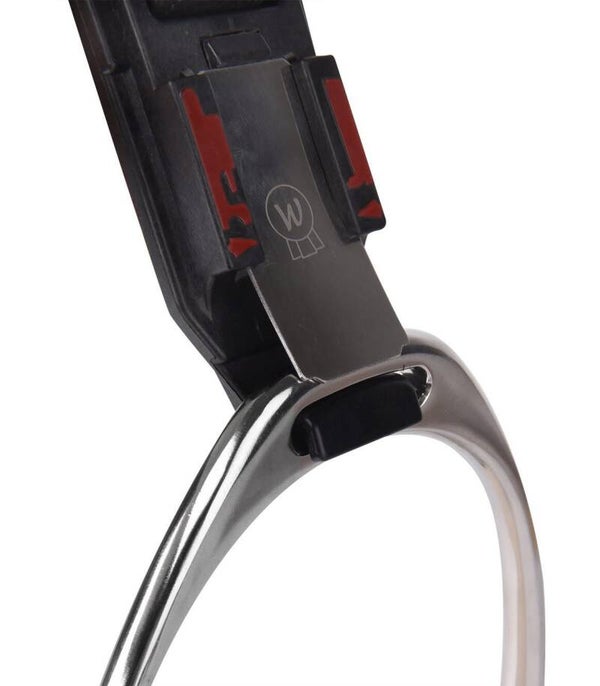 De nieuwe stijgbeugelbeveiliging van Waldhausen. Als de voet van de ruiter in de stijgbeugel vast komt te zitten, komt de ruiter bij een val van het paard los van het paard. Als de stijgbeugel een bepaalde hoek bereikt in de veiligheidsclip, komen de twee van elkaar los. Belangrijk: let bij het bevestigen goed op de montage-instructies.