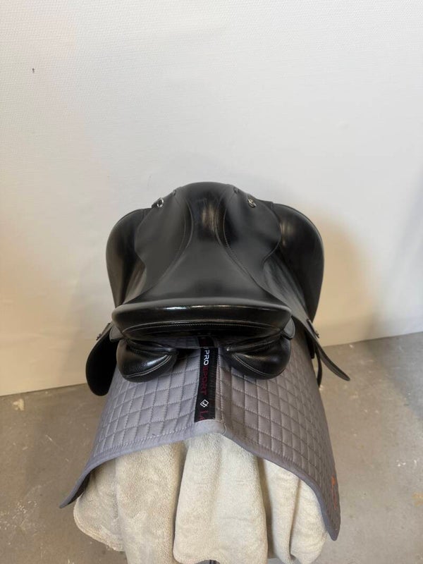 Mooi Stübben Virginia dressuurzadel in 17,5 inch en met lakdetails op de lepel en de beugelriemhouder. Het zadel verkeerd nog in een hele nette staat.