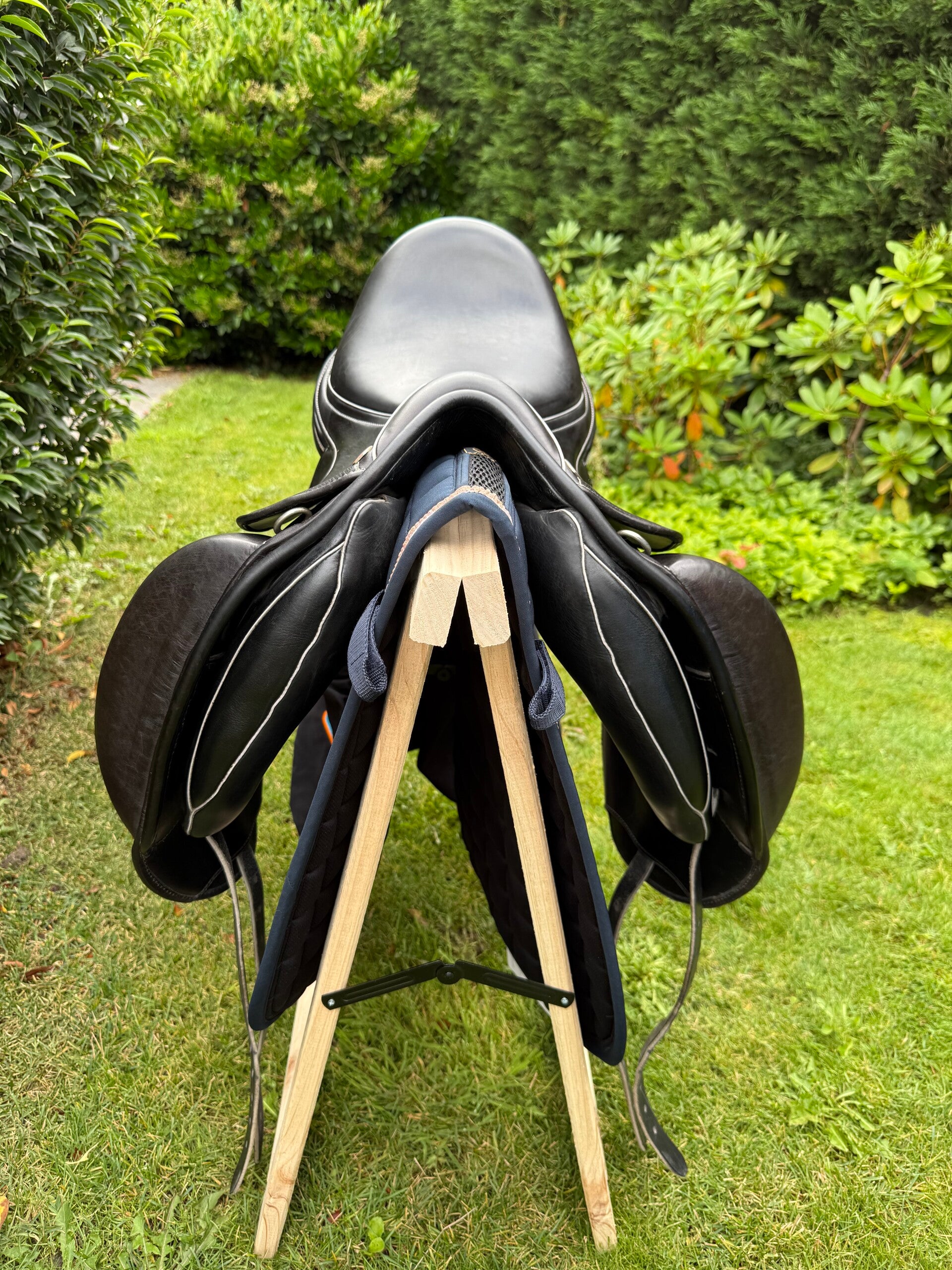 Heel net Sella Velluto dressuurzadel in 18 inch en medium tot medium wijde boom (aanpasbaar door Sella). Monoblad en voorzien van een ingebouwde voorsingel wat naar voren schuiven van het zadel wordt voorkomen. Indien het paard meer schoudervrijheid nodig heeft is deze door ons naar achteren te verplaatsen.