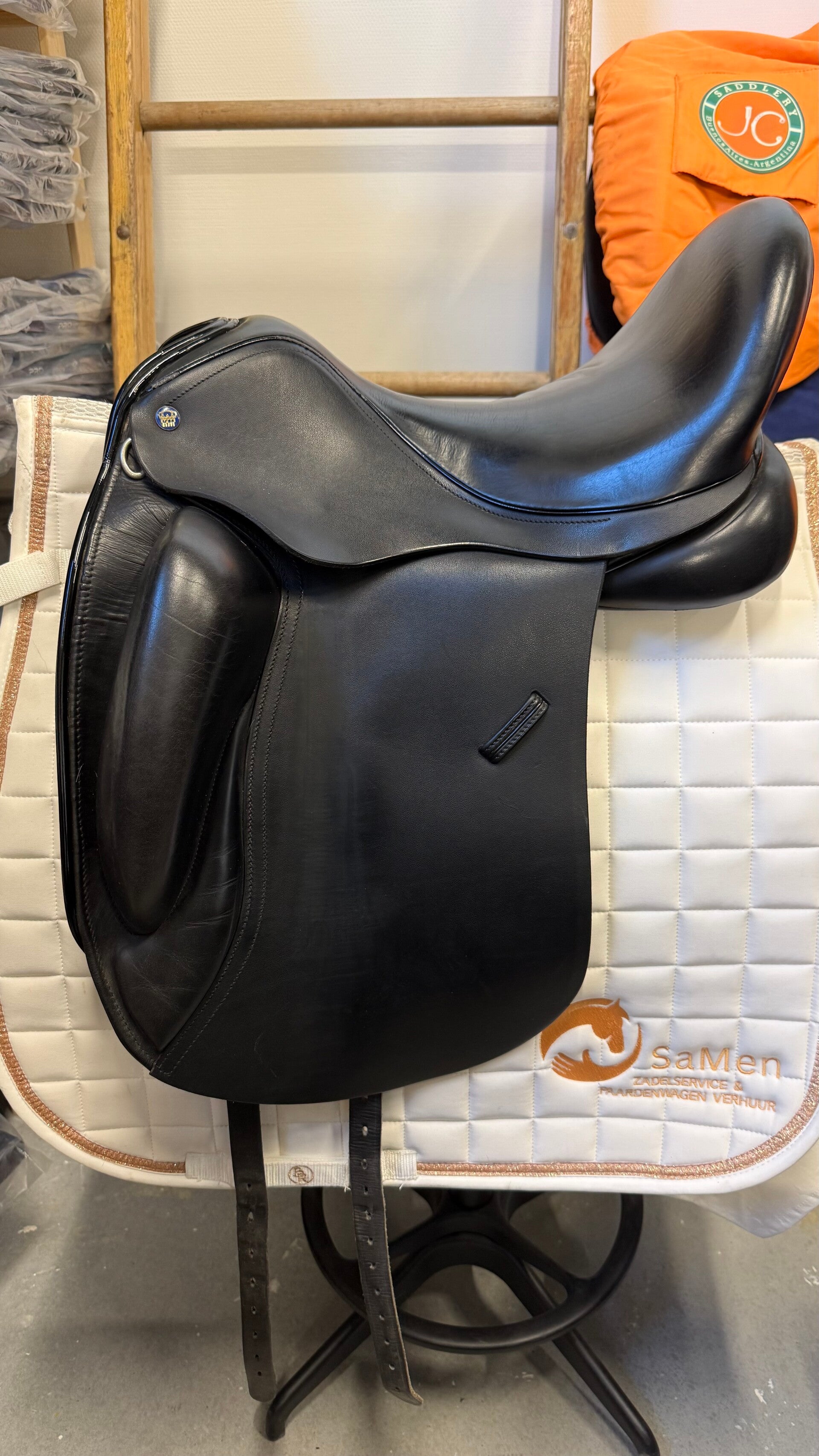 Nog zeer net KM Custom dressuurzadel met wrongen op het zweetblad. Alleen het lakbiesje op de zitting vertoont slijtage. Verder is het zadel in een zeer nette staat.